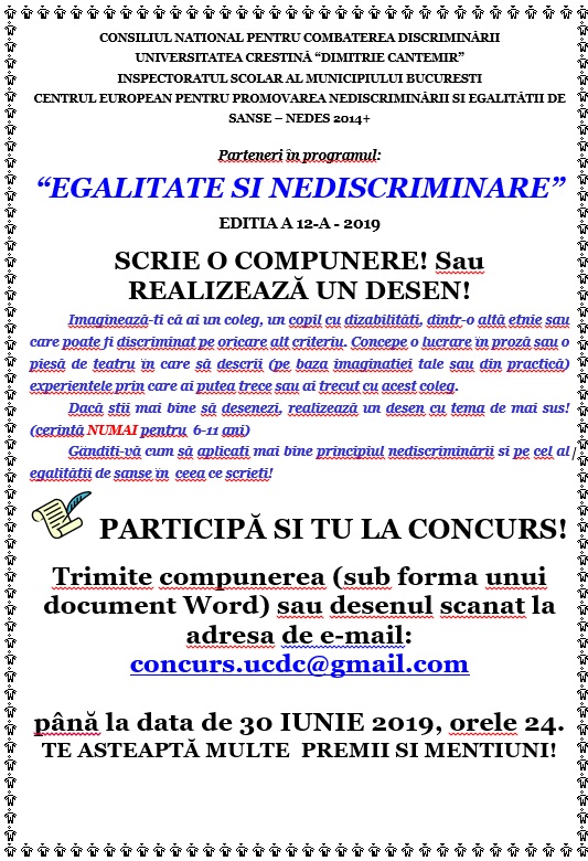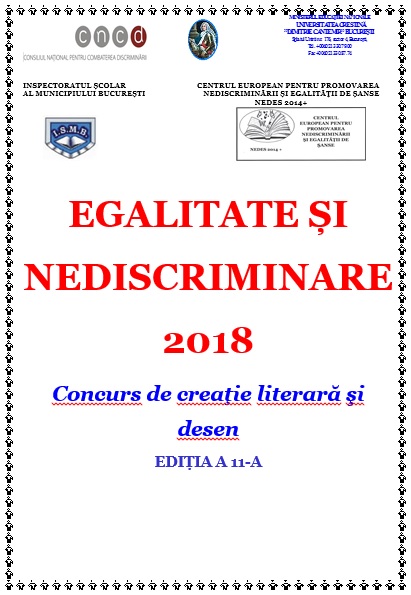 Concursul de creatie literară si desen ”Egalitate si nediscriminare”este organizat în parteneriat de Universitatea Crestină ”Dimitrie Cantemir” Bucuresti, Consiliul National pentru Combaterea Discriminării si Inspectoratul Scolar al Municipiului Bucuresti în cadrul proiectului de cercetare-dezvoltare ”Promovarea dreptului la nediscriminare si egalitate de sanse la nivelul învătământului preuniversitar din Bucuresti”. Din anul 2016, s-a alăturat organizatorilor si Centrul European pentru Promovarea Nediscriminării si Egalitătii de Sanse – NEDES 2014+ condus de prof.univ.dr. Mădălina Tomescu